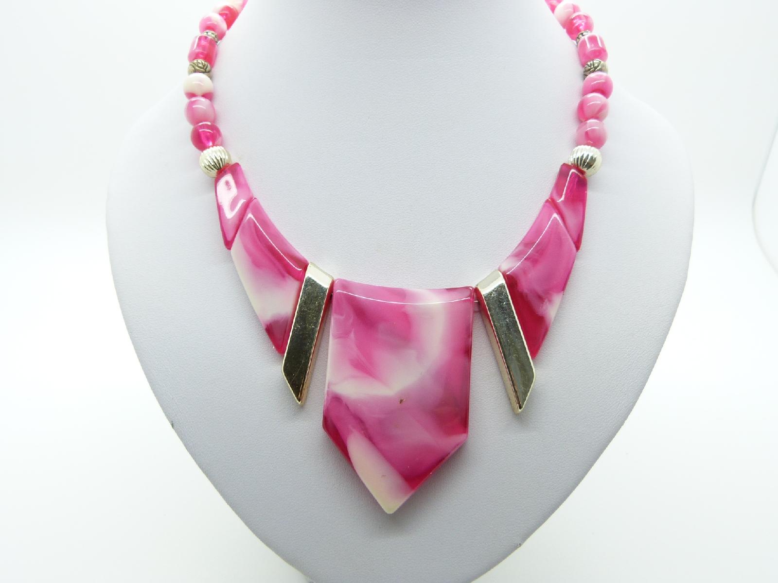 Vintage 70s Funky Pink and White Marble Effect Lucite Statement Necklace