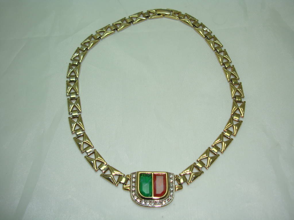 Vintage 80s  Red and Green Glass Diamante Fancy Gold Link Necklace FAB