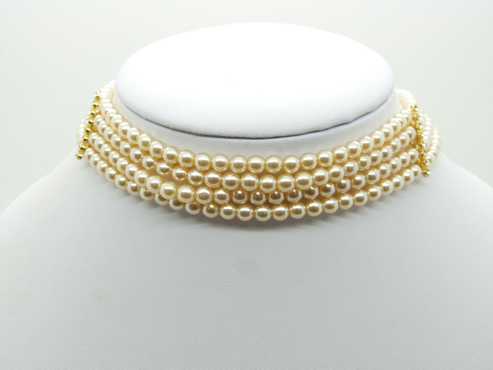Vintage 80s 4 Row Faux Pearl Bead Choker Necklace Stunning Diamante Clasp!