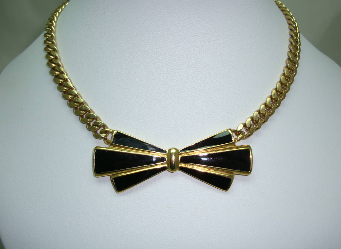 Vintage 80s Adorable Black Enamel and Gold Bow Necklace Named