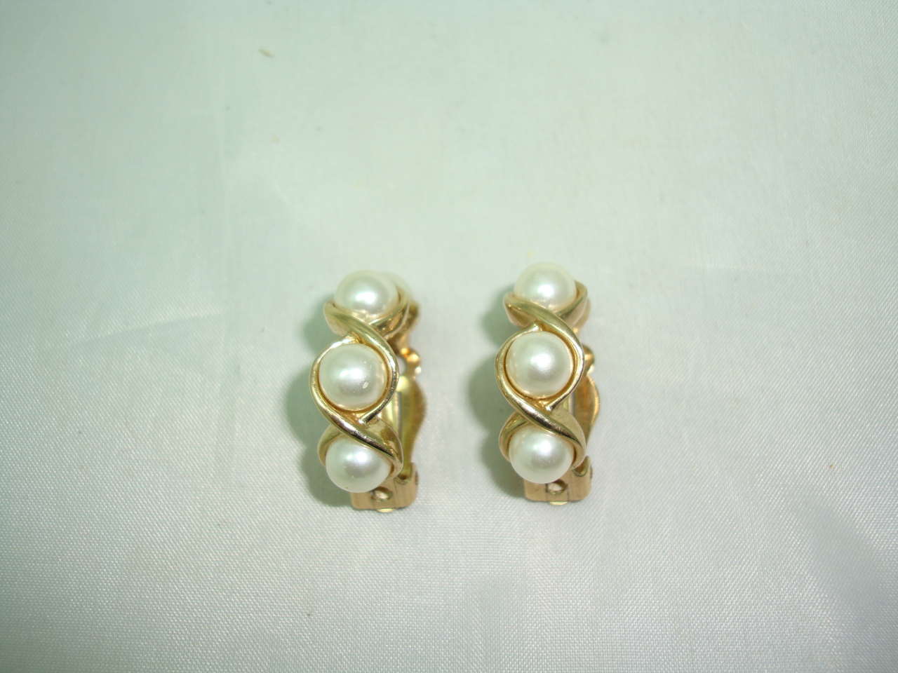 We are pleased to offer this vintage 1980s pair of faux pearl and goldtone half hoop style clip on earrings.  Excellent vintage condition, very classy and chic, will go with absolutely anything, a timeless classic.