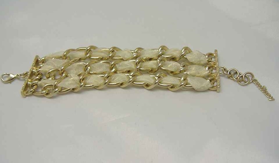 Stunning genuine Mikey vintage 90s goldtone chain bracelet interspersed with cream organza material - really stunning. Excellent condition, comes with the Mikey trademark tag - this is a great quality bracelet which will go with absolutely everything - a real statement piece! I don't usually go for modern jewellery but I could not resist this one as it is great quality and looks very stylish and classy.  Would have been very expensive to buy as Mikey jewellery is quite pricey.