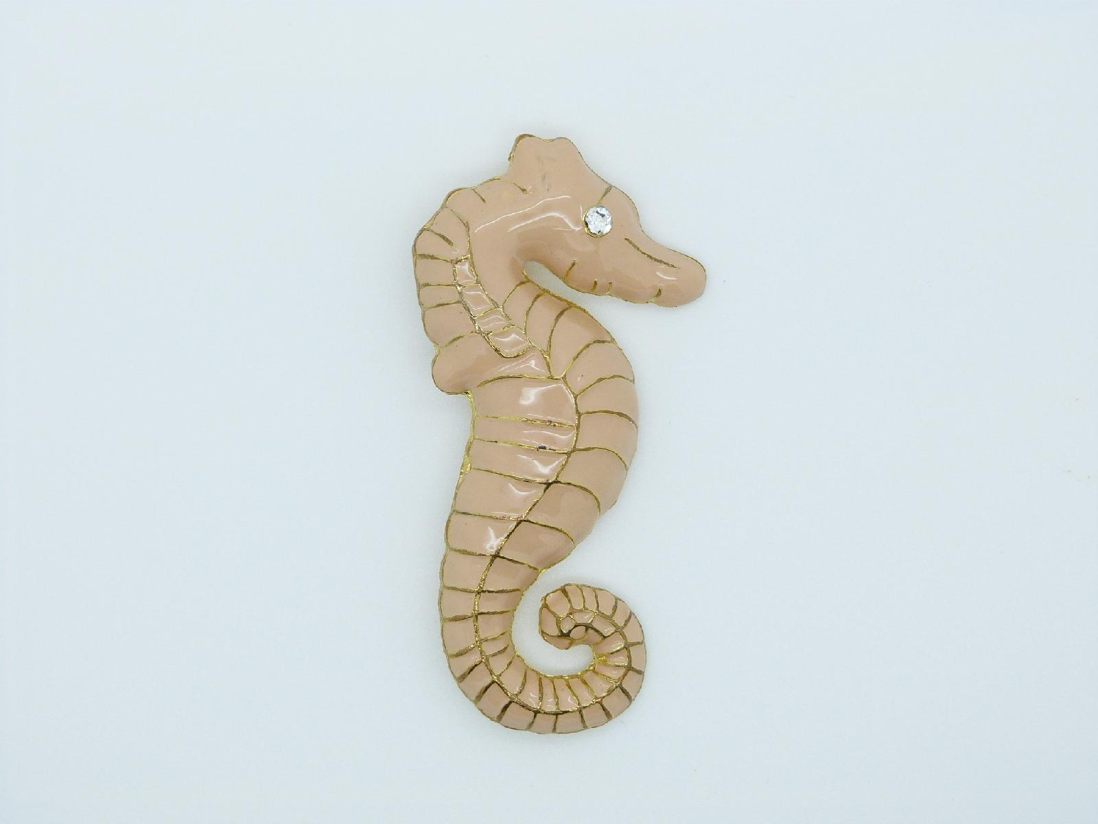Vintage 80s Large Pink Enamel Goldtone Seahorse Brooch with Diamante Eye