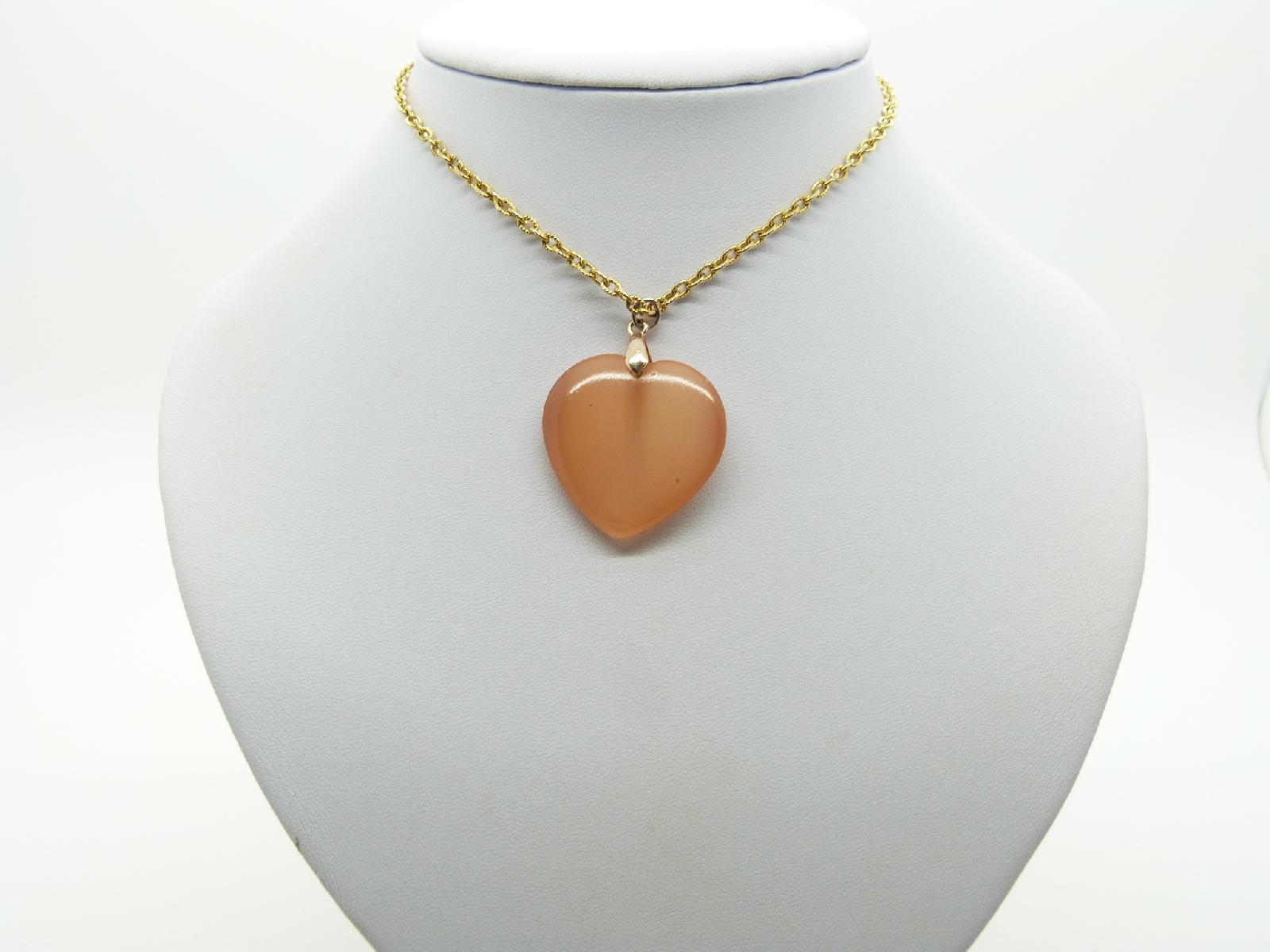 Pretty vintage 1980s unusual moonglow glass peach coloured heart pendant with long goldtone chain, excellent condition, chain measures 54cms in length, pendant measures 3cms.