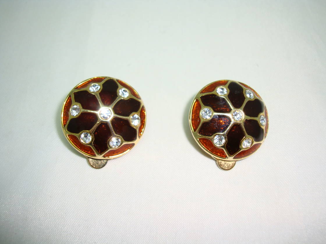 Vintage 1980s quality domed brown and gold enamel goldtone clip on earrings studded with sparkling crystal/diamante stones.  Excellent vintage condition, a very well made pair of quality vintage earrings.