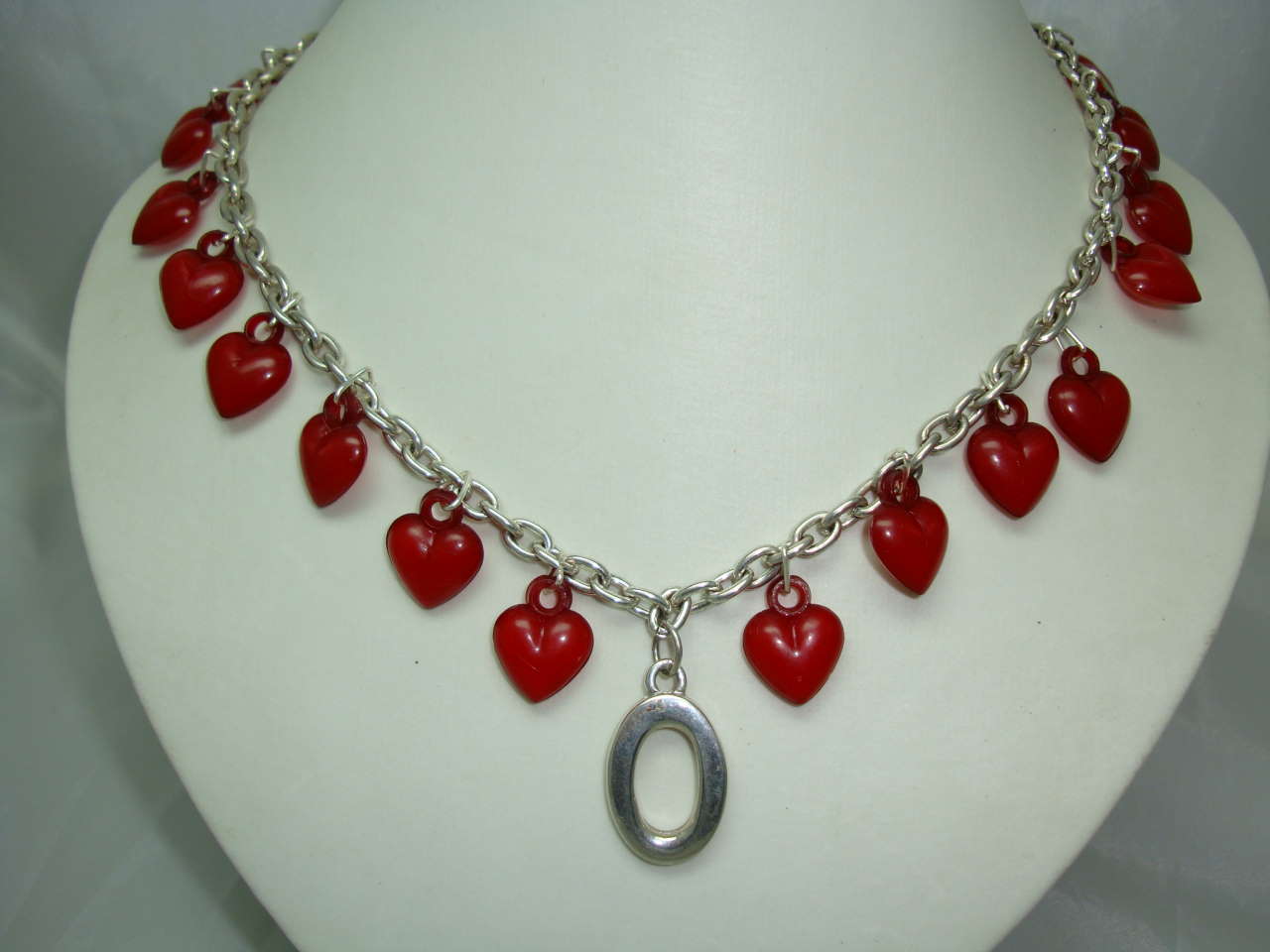 We are pleased to offer this fabulous vintage 1980s silvertone link necklace decorated with red lucite heart charm beads with a central silvertone oval dropper.  As you can see from the photos, the necklace is in excellent condition, comes with silvertone toggle clasp, looks really fab on, very unique and unusual.