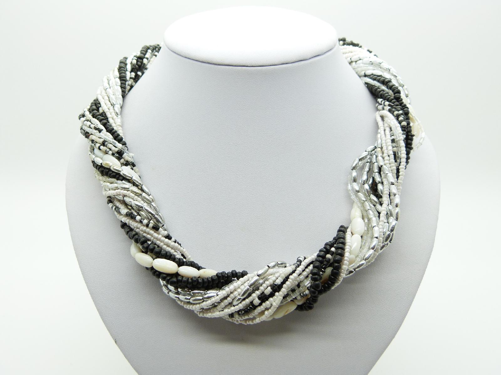 Vintage 80s Super Black White and Silver Multi Strand Bead Twist Necklace