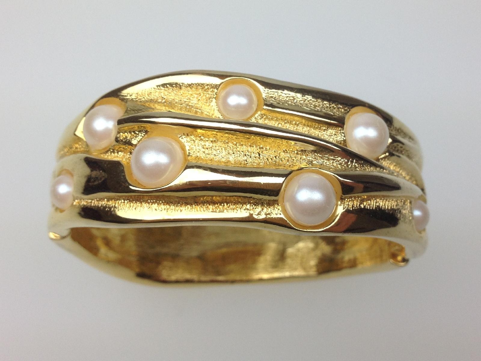 Vintage 80s Wide Goldtone Glass Faux Pearl Clamper Cuff Hinged Bracelet