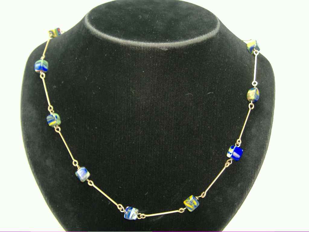 We are pleased to offer this lovely Vintage 30s Art Deco vintage end of day muticoloured square shaped glass bead necklace on rolled gold wire links.  As you can see from the photos, the necklace is in excellent condition and  looks fab on, don't miss out on this one.