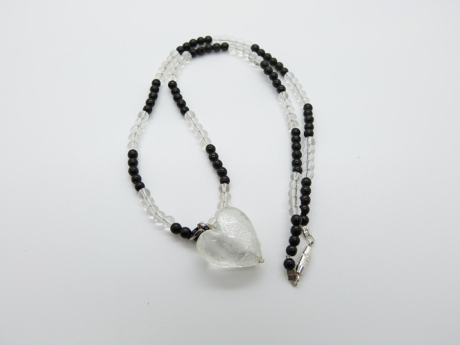 Vintage Redesigned Black and Clear Glass Bead Necklace White Heart Pendant