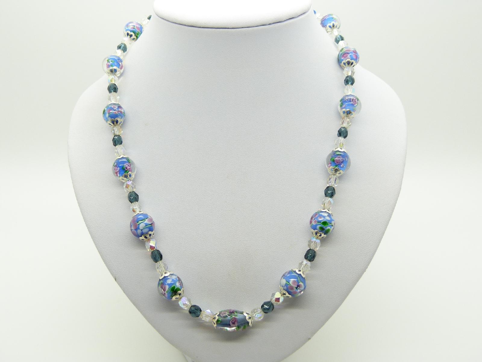 Vintage Redesigned Blue Flower Murano Glass and Crystal Bead Necklace
